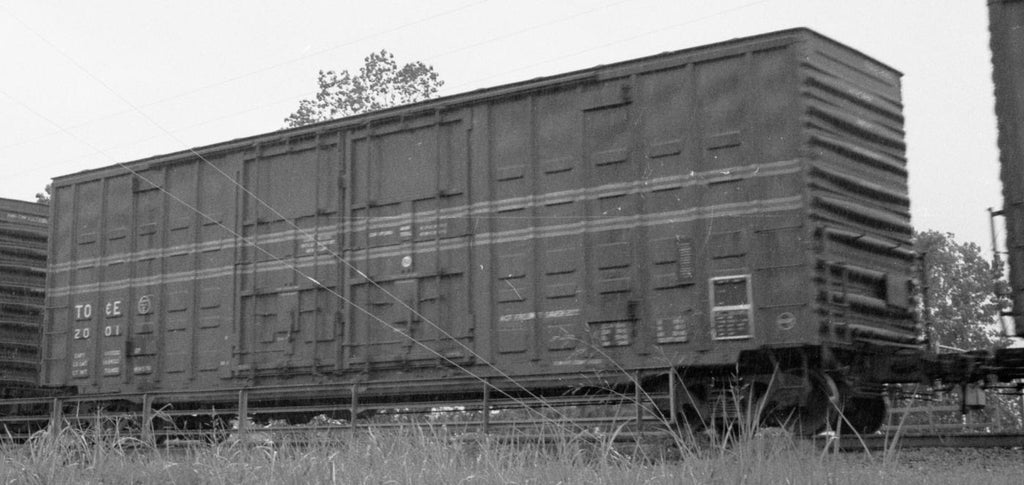 ACF Industries (ACF) started producing this general type of 70t Hi-Cube exterior post designed car in 1971, the design developed further in 1973-74 which is the prototype of this car. Specifically this version with uneven sized waffles to strengthen side walls with thinner material. We believe this car design was tailored to one customer Weyerhaeuser for paperboard loading at several plant locations in their nationwide network (including Canada). Paperboard is the raw material used in the making of carboard boxes. The Hi-Cube height was important to accommodate various sizes of paper rolls, with either one-high, two-high or three-high depending on internal or external customer requests. The Plate clearance for these cars pre-dates the Plate F introduction so they were marked with Exceeds Plate C. Even with it's height these cars travelled throughout the US and Canada and usually ganged together into small blocks of cars. So, it was common to see all railroad schemes in one string together.