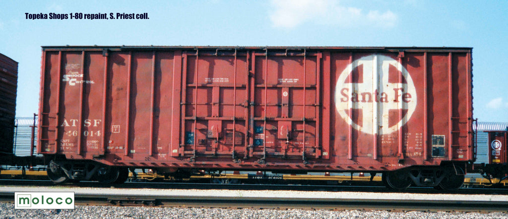 The Super Shock-Control logo signifies Keystone brand 20-inch cushioning, which ATSF had a large capital stake in the development of the device. Note this a repaint version with many variations from the delivery scheme. By the 1980 date of this repaint, the cars were marked Plate F rather than Exceed Plate C. Also note the change of the truck type to Hydrashox trucks.
